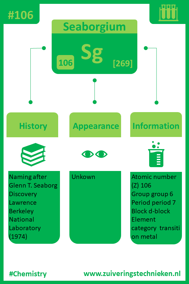 Atoomnummer 106 is seaborgium met symbool Sg. Er zitten diverse elementen in het periodiek systeem en in de infographic is gedetaileerde informatie te vinden over dit element.