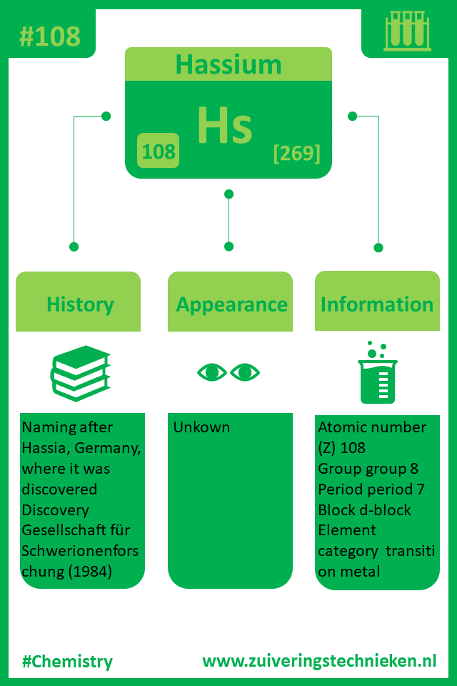 Atoomnummer 108 is hassium met symbool Hs. Er zitten diverse elementen in het periodiek systeem en in de infographic is gedetaileerde informatie te vinden over dit element.