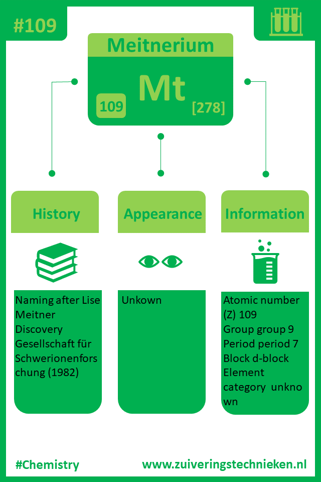 Atoomnummer 109 is meitnerium met symbool Mt. Er zitten diverse elementen in het periodiek systeem en in de infographic is gedetaileerde informatie te vinden over dit element.