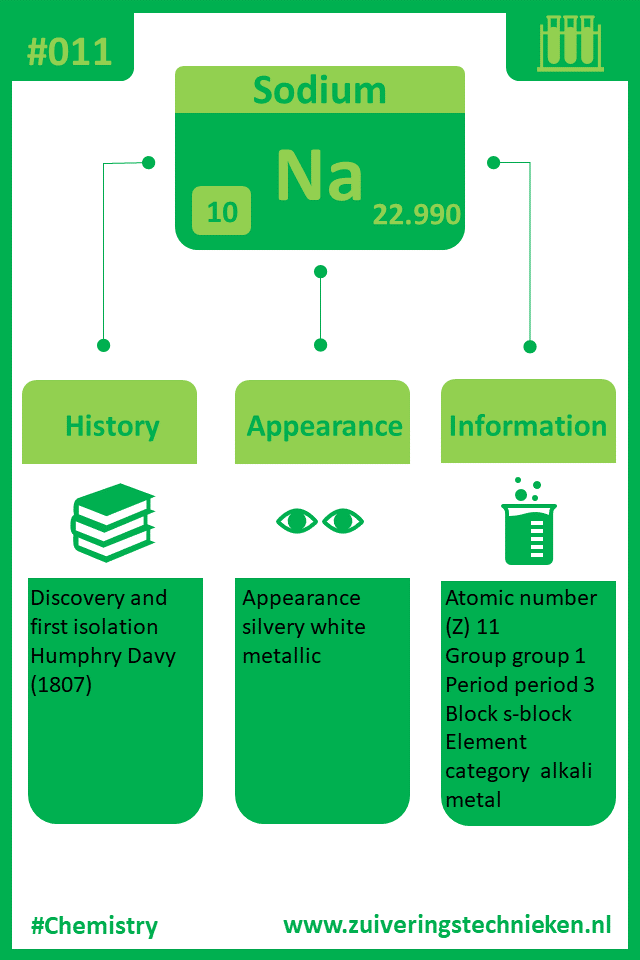Atoomnummer 11 is natrium met symbool Na. Er zitten diverse elementen in het periodiek systeem en in de infographic is gedetaileerde informatie te vinden over dit element.