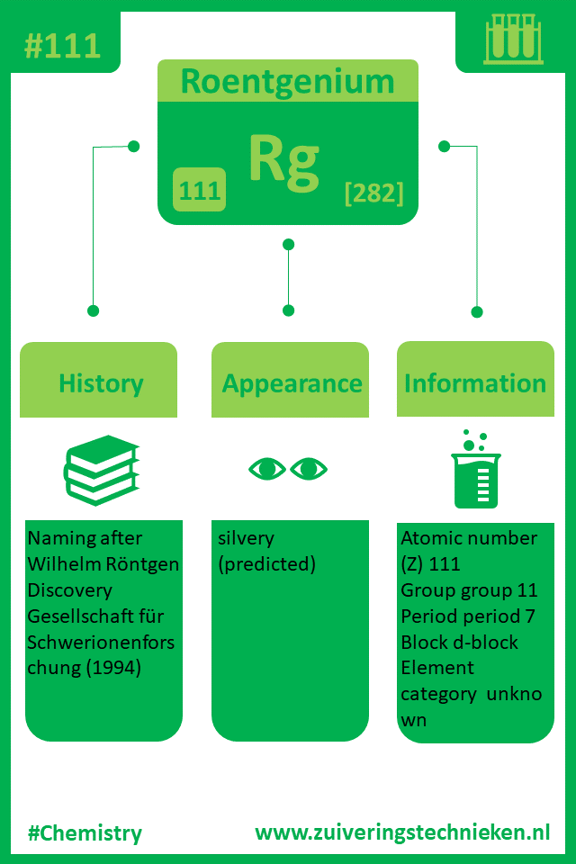 Atoomnummer 111 is roentgenium met symbool Rg. Er zitten diverse elementen in het periodiek systeem en in de infographic is gedetaileerde informatie te vinden over dit element.