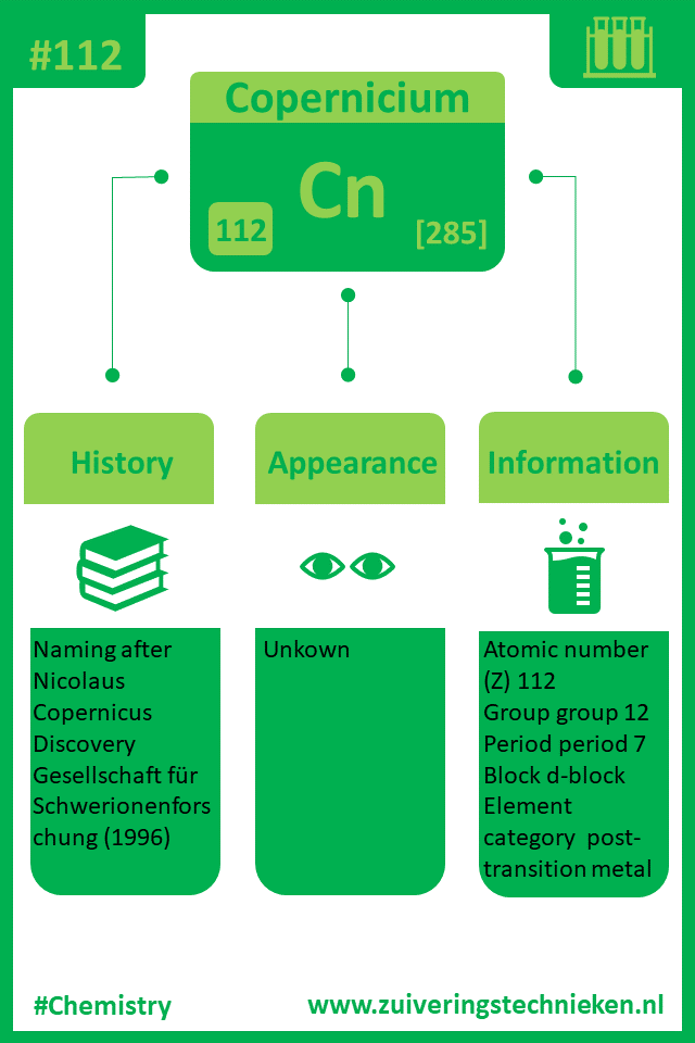 Atoomnummer 112 is copernicium met symbool Cn. Er zitten diverse elementen in het periodiek systeem en in de infographic is gedetaileerde informatie te vinden over dit element.