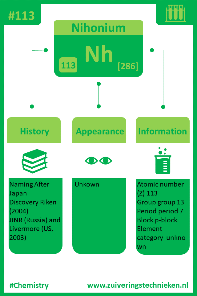Atoomnummer 113 is nihonium met symbool Nh. Er zitten diverse elementen in het periodiek systeem en in de infographic is gedetaileerde informatie te vinden over dit element.
