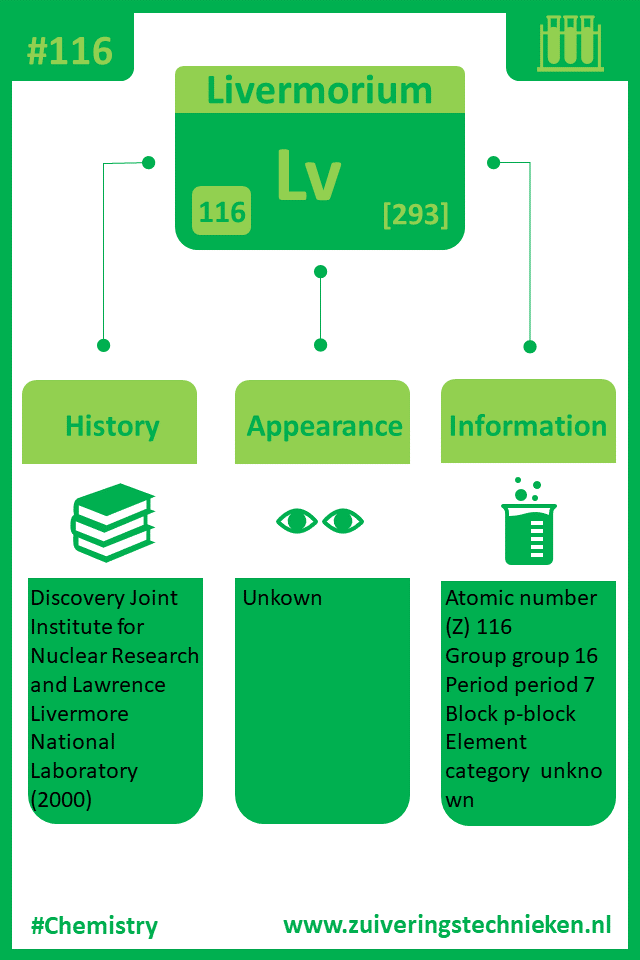 Atoomnummer 116 is livermorium met symbool Lv. Er zitten diverse elementen in het periodiek systeem en in de infographic is gedetaileerde informatie te vinden over dit element.