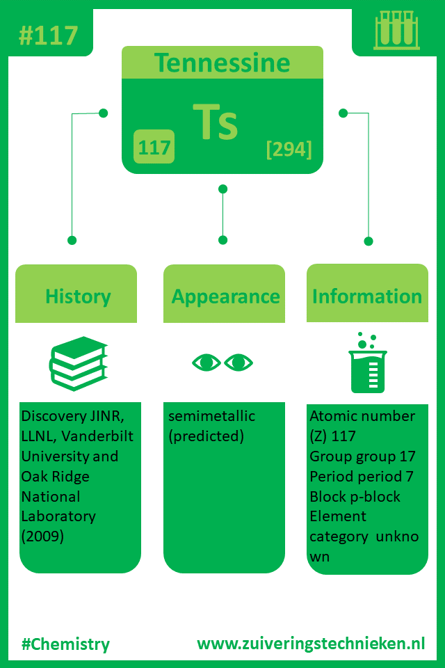 Atoomnummer 117 is tennessine met symbool Ts. Er zitten diverse elementen in het periodiek systeem en in de infographic is gedetaileerde informatie te vinden over dit element.