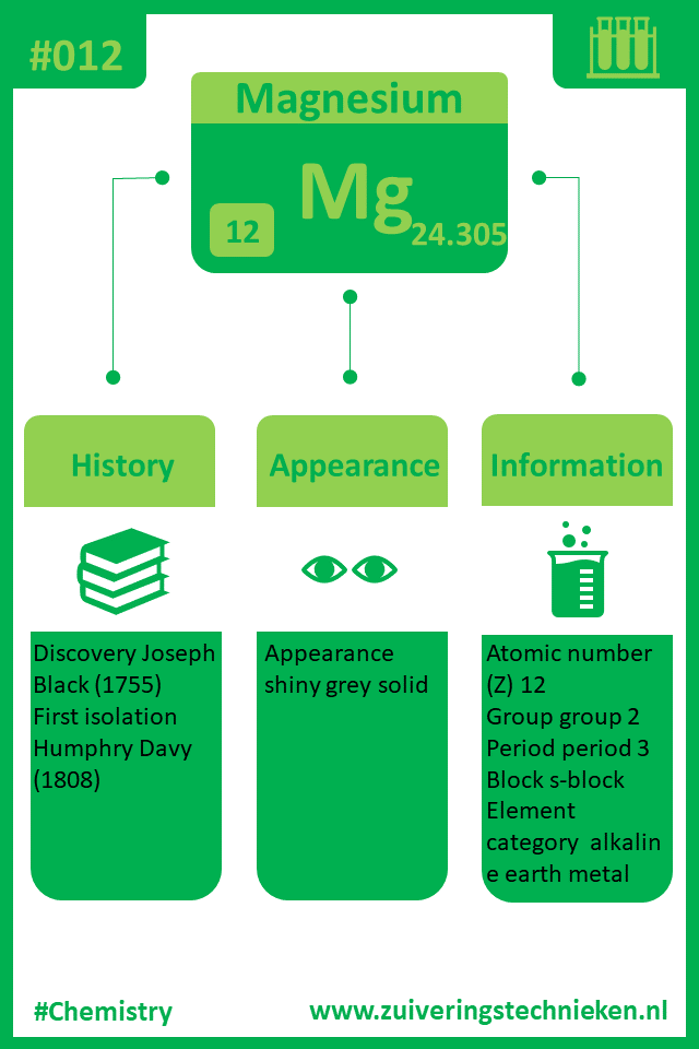 Atoomnummer 12 is magnesium met symbool Mg. Er zitten diverse elementen in het periodiek systeem en in de infographic is gedetaileerde informatie te vinden over dit element.