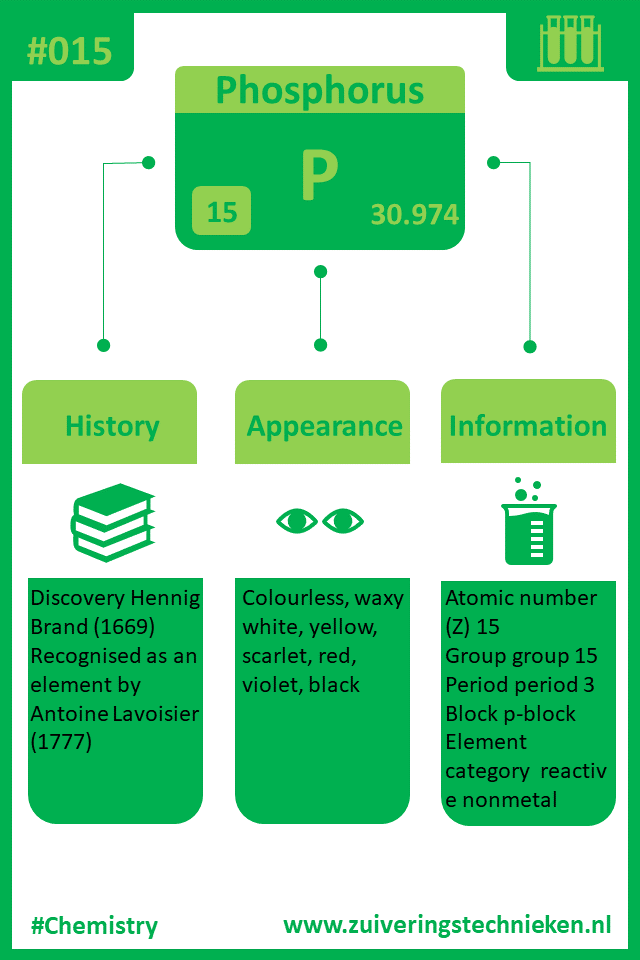 Atoomnummer 15 is fosfor met symbool P. Er zitten diverse elementen in het periodiek systeem en in de infographic is gedetaileerde informatie te vinden over dit element.