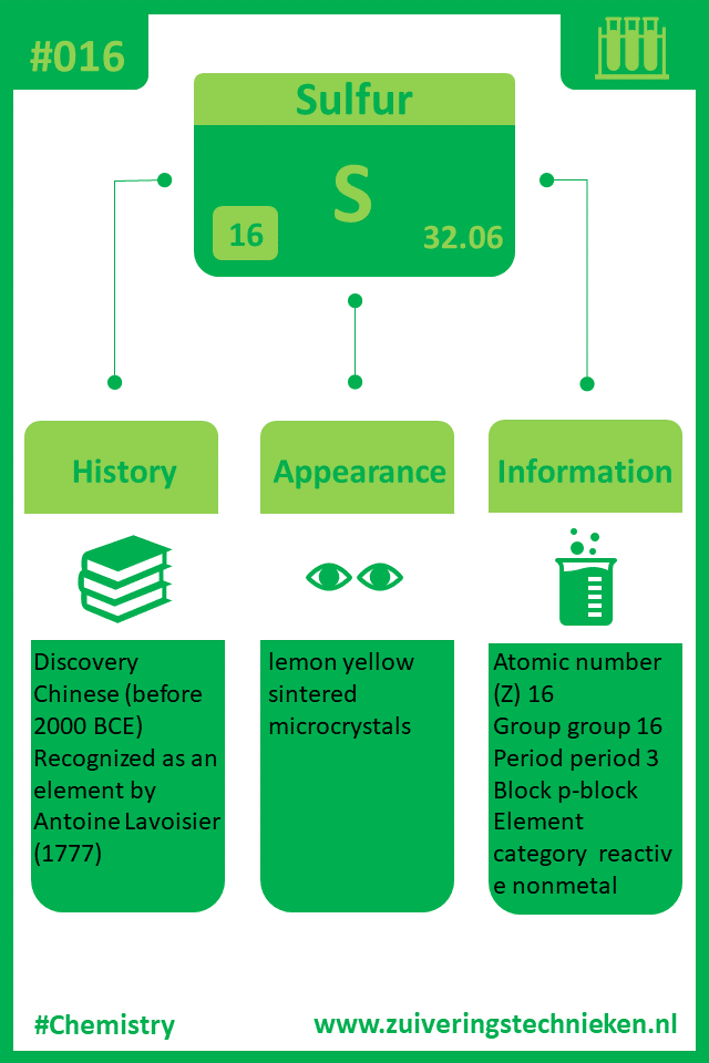 Atoomnummer 16 is zwavel met symbool S. Er zitten diverse elementen in het periodiek systeem en in de infographic is gedetaileerde informatie te vinden over dit element.