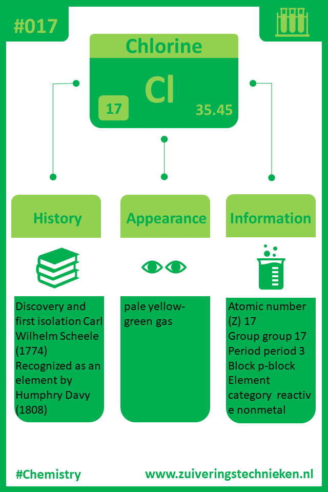 Atoomnummer 17 is chloor met symbool Cl. Er zitten diverse elementen in het periodiek systeem en in de infographic is gedetaileerde informatie te vinden over dit element.
