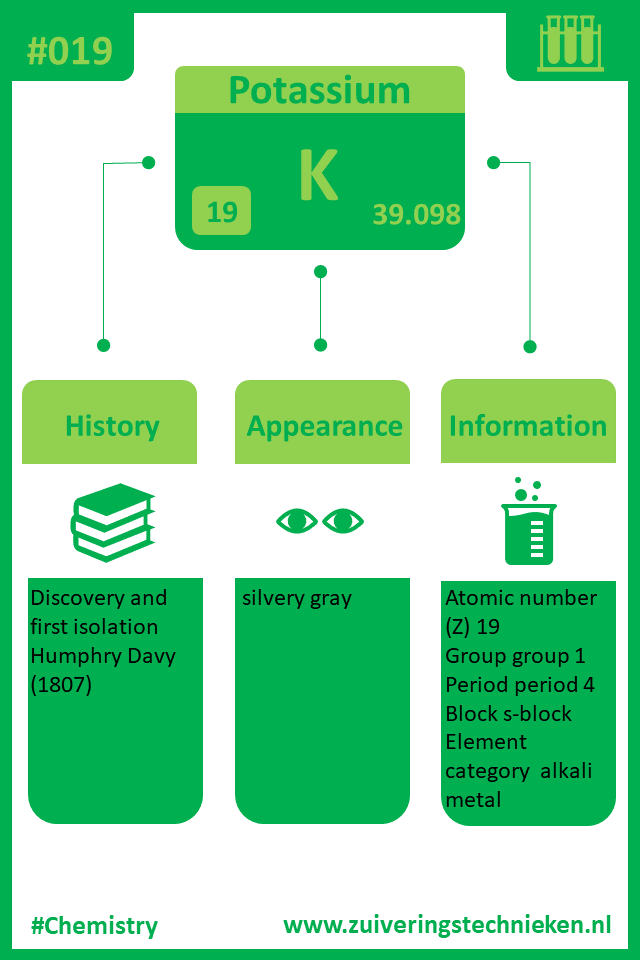 Atoomnummer 19 is kalium met symbool K. Er zitten diverse elementen in het periodiek systeem en in de infographic is gedetaileerde informatie te vinden over dit element.