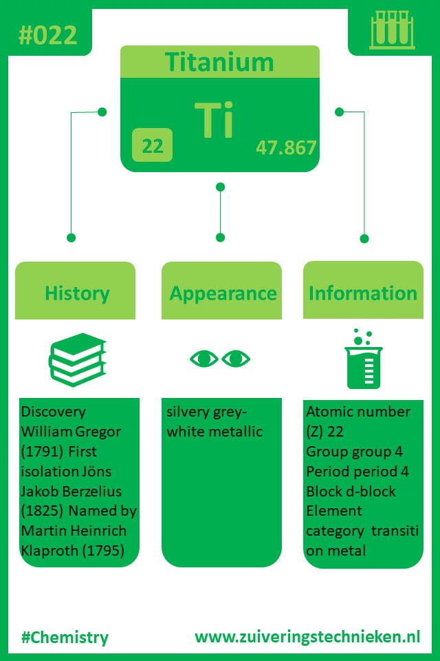 Atoomnummer 22 is titanium met symbool Ti. Er zitten diverse elementen in het periodiek systeem en in de infographic is gedetaileerde informatie te vinden over dit element.