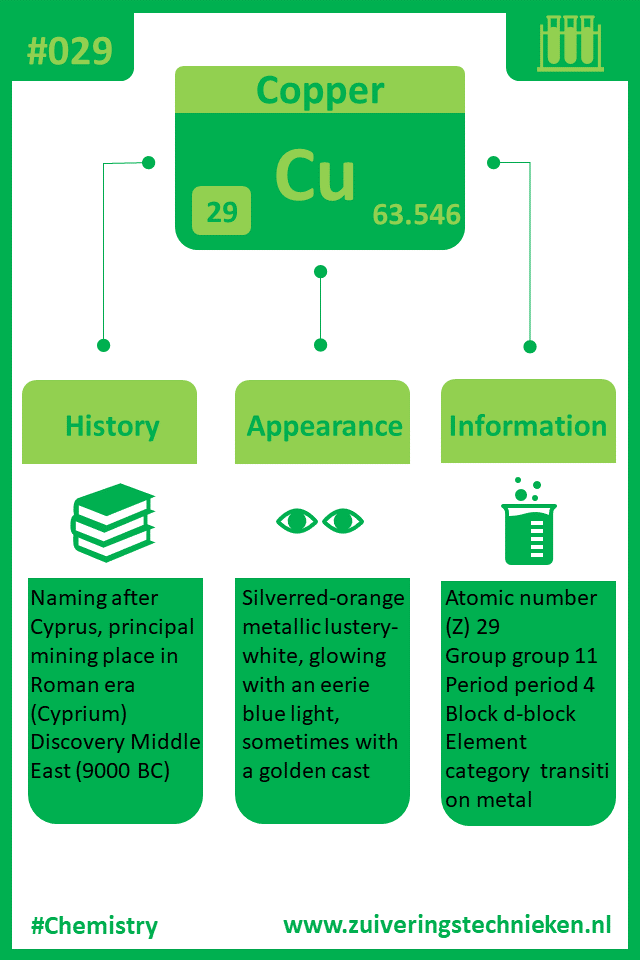 Atoomnummer 29 is koper met symbool Cu. Er zitten diverse elementen in het periodiek systeem en in de infographic is gedetaileerde informatie te vinden over dit element.