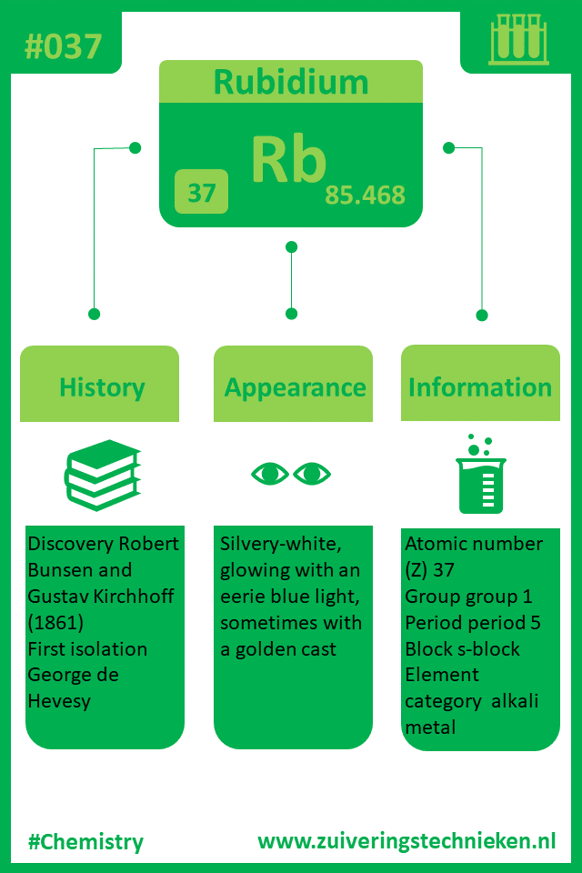 Atoomnummer 37 is rubidium met symbool Rb. Er zitten diverse elementen in het periodiek systeem en in de infographic is gedetaileerde informatie te vinden over dit element.