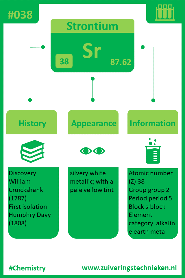 Atoomnummer 38 is strontium met symbool Sr. Er zitten diverse elementen in het periodiek systeem en in de infographic is gedetaileerde informatie te vinden over dit element.