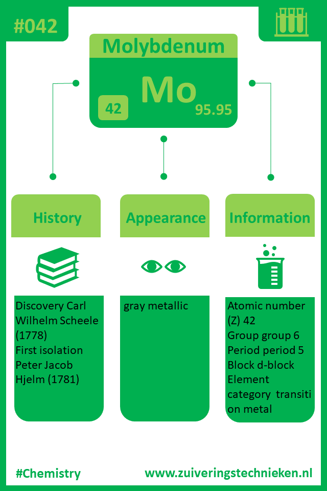 Atoomnummer 42 is molybdeen met symbool Mo. Er zitten diverse elementen in het periodiek systeem en in de infographic is gedetaileerde informatie te vinden over dit element.