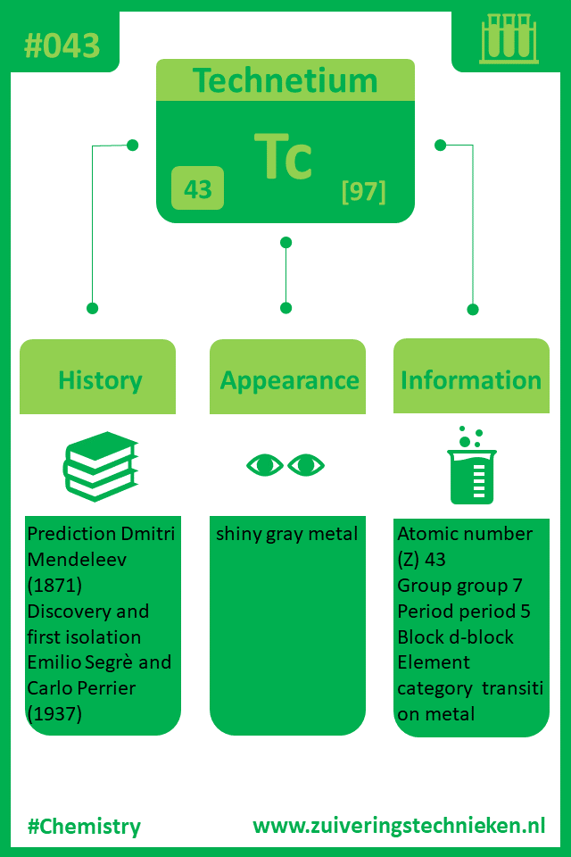 Atoomnummer 43 is technetium met symbool Tc. Er zitten diverse elementen in het periodiek systeem en in de infographic is gedetaileerde informatie te vinden over dit element.