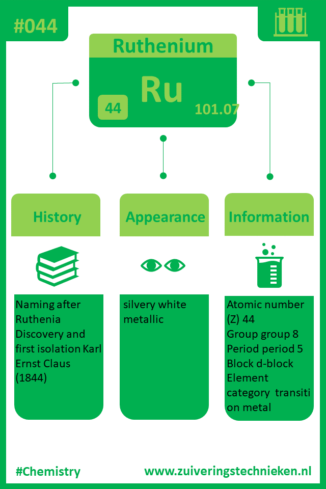 Atoomnummer 44 is ruthenium met symbool Ru. Er zitten diverse elementen in het periodiek systeem en in de infographic is gedetaileerde informatie te vinden over dit element.