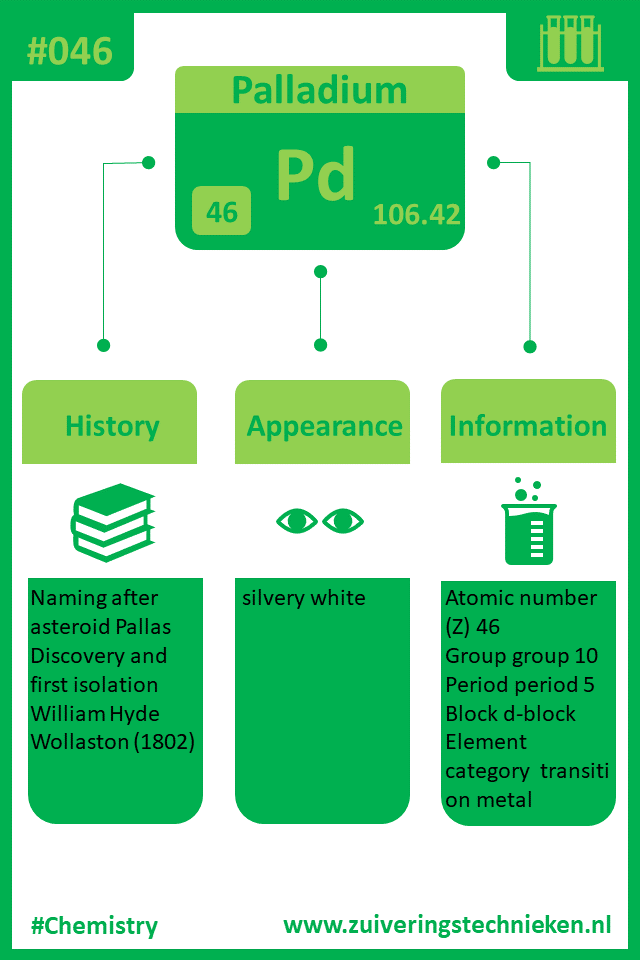 Atoomnummer 46 is palladium met symbool Pd. Er zitten diverse elementen in het periodiek systeem en in de infographic is gedetaileerde informatie te vinden over dit element.