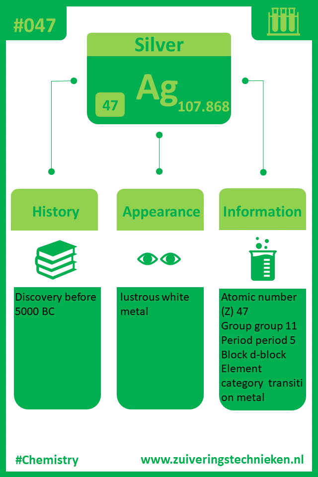 Atoomnummer 47 is zilver met symbool Ag. Er zitten diverse elementen in het periodiek systeem en in de infographic is gedetaileerde informatie te vinden over dit element.