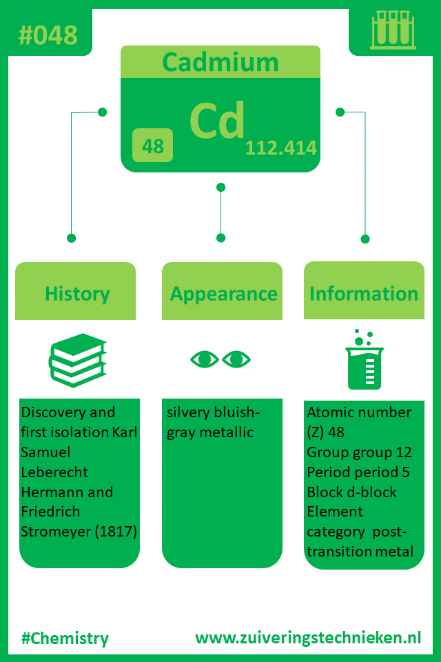 Atoomnummer 48 is cadmium met symbool Cd. Er zitten diverse elementen in het periodiek systeem en in de infographic is gedetaileerde informatie te vinden over dit element.