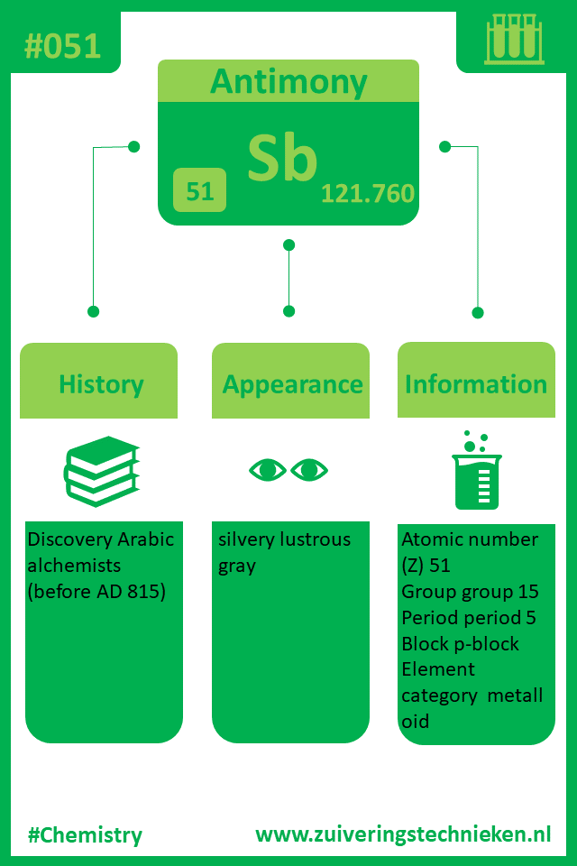 Atoomnummer 51 is antimoon met symbool Sb. Er zitten diverse elementen in het periodiek systeem en in de infographic is gedetaileerde informatie te vinden over dit element.