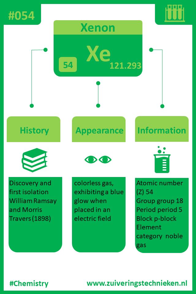 Atoomnummer 54 is xenon met symbool Xe. Er zitten diverse elementen in het periodiek systeem en in de infographic is gedetaileerde informatie te vinden over dit element.