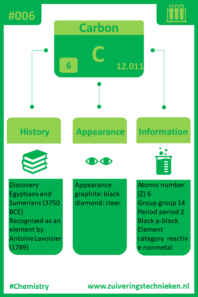 Atoomnummer 6 is koolstof met symbool C. Er zitten diverse elementen in het periodiek systeem en in de infographic is gedetaileerde informatie te vinden over dit element.