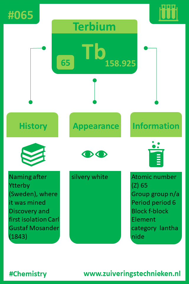 Atoomnummer 65 is terbium met symbool Tb. Er zitten diverse elementen in het periodiek systeem en in de infographic is gedetaileerde informatie te vinden over dit element.