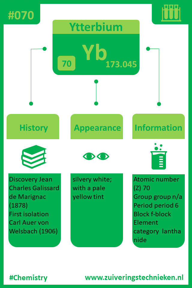 Atoomnummer 70 is ytterbium met symbool Yb. Er zitten diverse elementen in het periodiek systeem en in de infographic is gedetaileerde informatie te vinden over dit element.