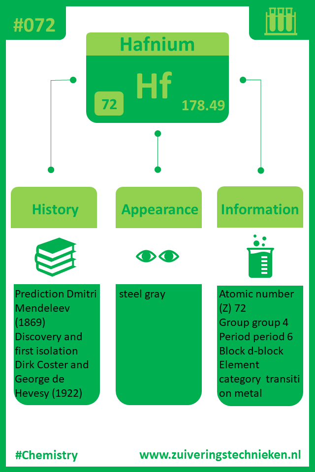 Atoomnummer 72 is hafnium met symbool Hf. Er zitten diverse elementen in het periodiek systeem en in de infographic is gedetaileerde informatie te vinden over dit element.