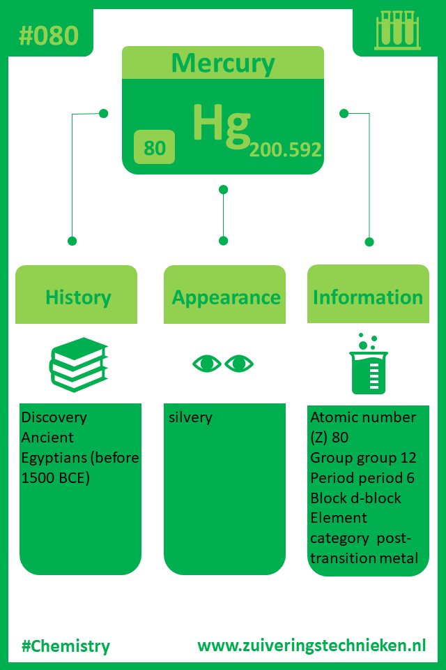 Atoomnummer 80 is kwik met symbool Hg. Er zitten diverse elementen in het periodiek systeem en in de infographic is gedetaileerde informatie te vinden over dit element.