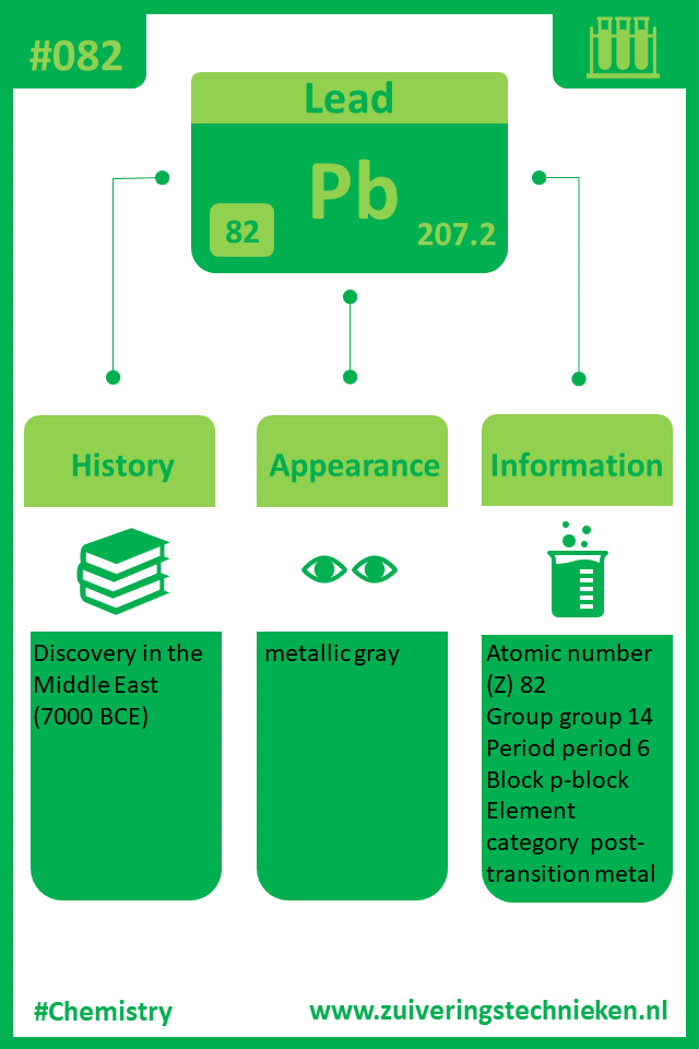 Atoomnummer 82 is lood met symbool Pb. Er zitten diverse elementen in het periodiek systeem en in de infographic is gedetaileerde informatie te vinden over dit element.
