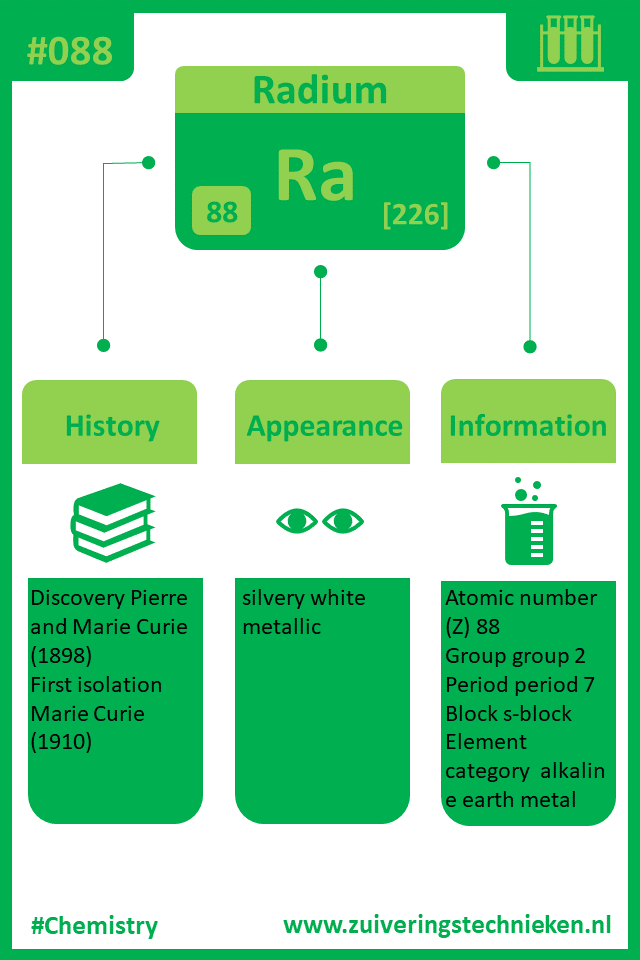 Atoomnummer 88 is radium met symbool Ra. Er zitten diverse elementen in het periodiek systeem en in de infographic is gedetaileerde informatie te vinden over dit element.