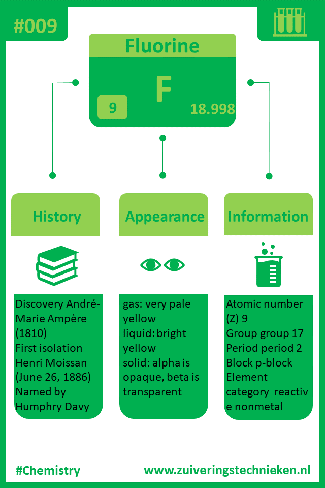 Atoomnummer 9 is fluor met symbool F. Er zitten diverse elementen in het periodiek systeem en in de infographic is gedetaileerde informatie te vinden over dit element.