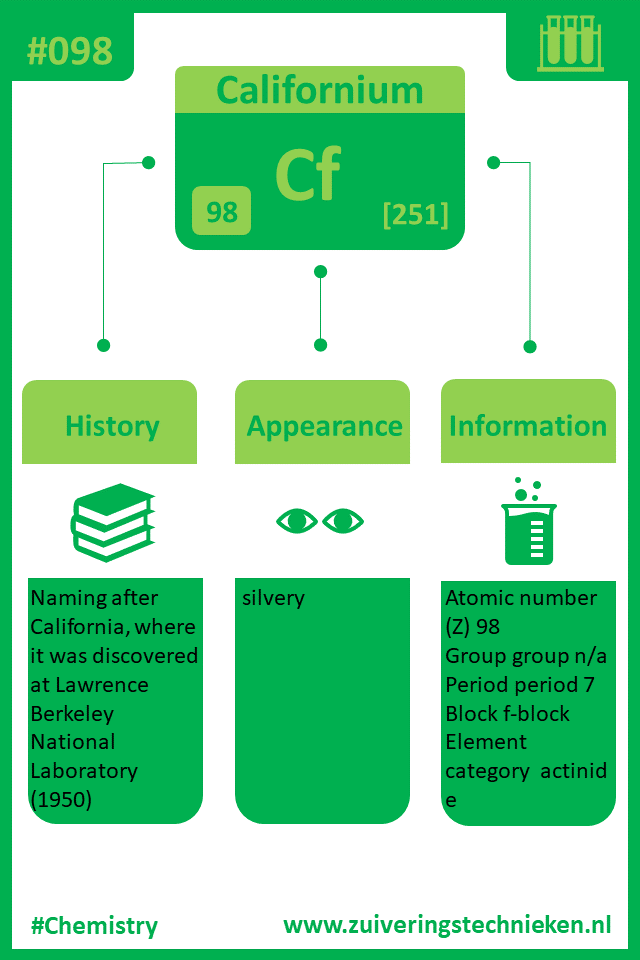 Atoomnummer 98 is californium met symbool Cf. Er zitten diverse elementen in het periodiek systeem en in de infographic is gedetaileerde informatie te vinden over dit element.